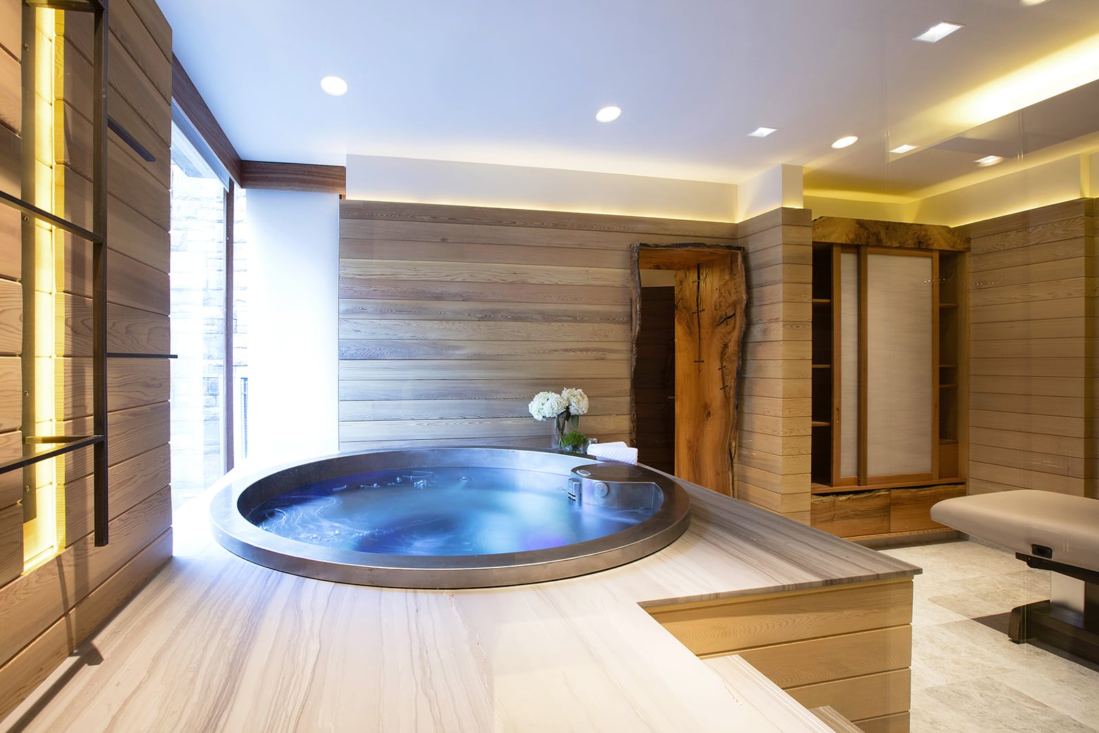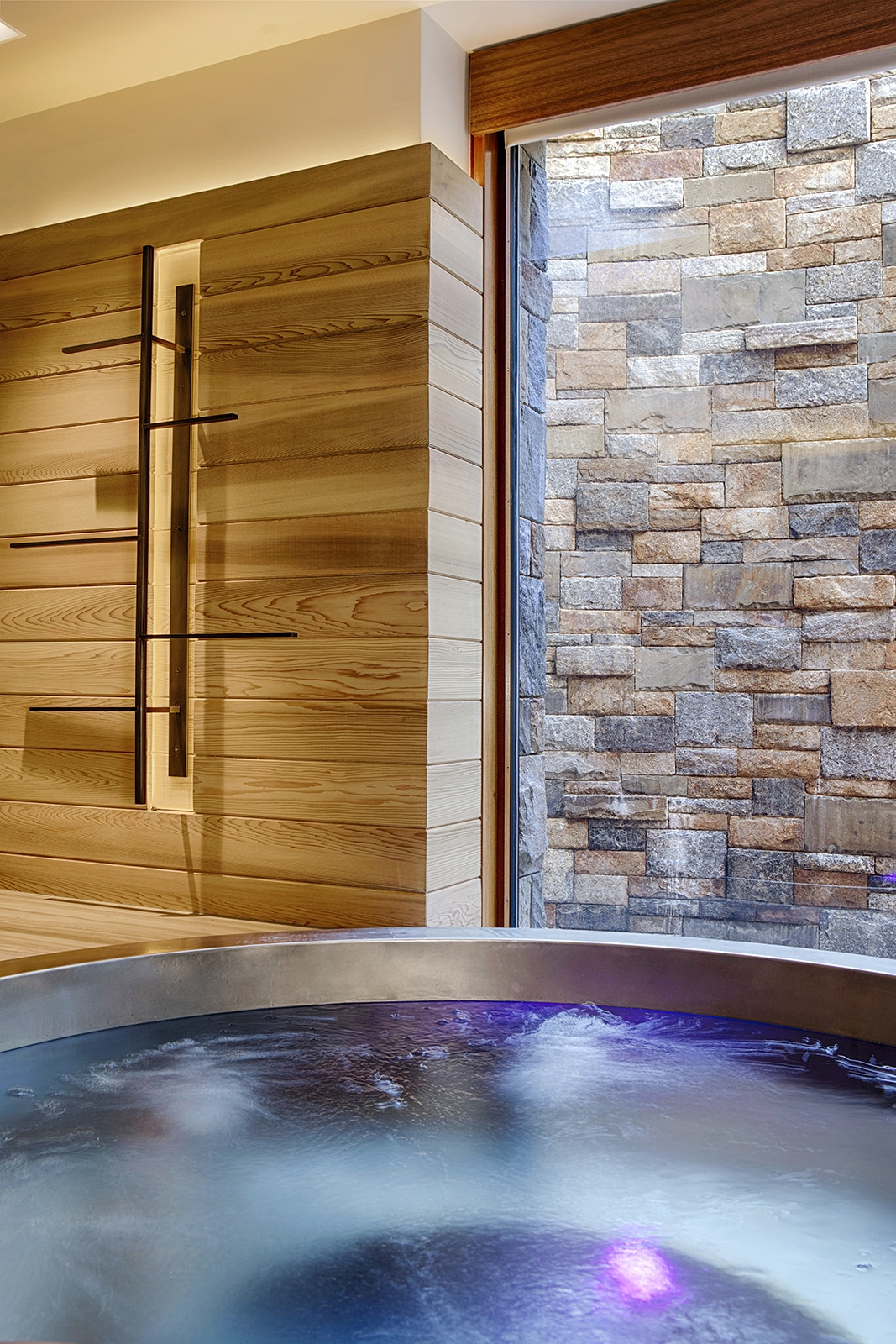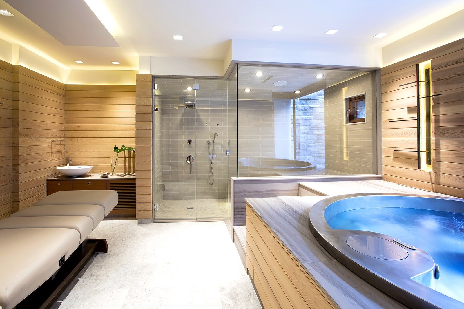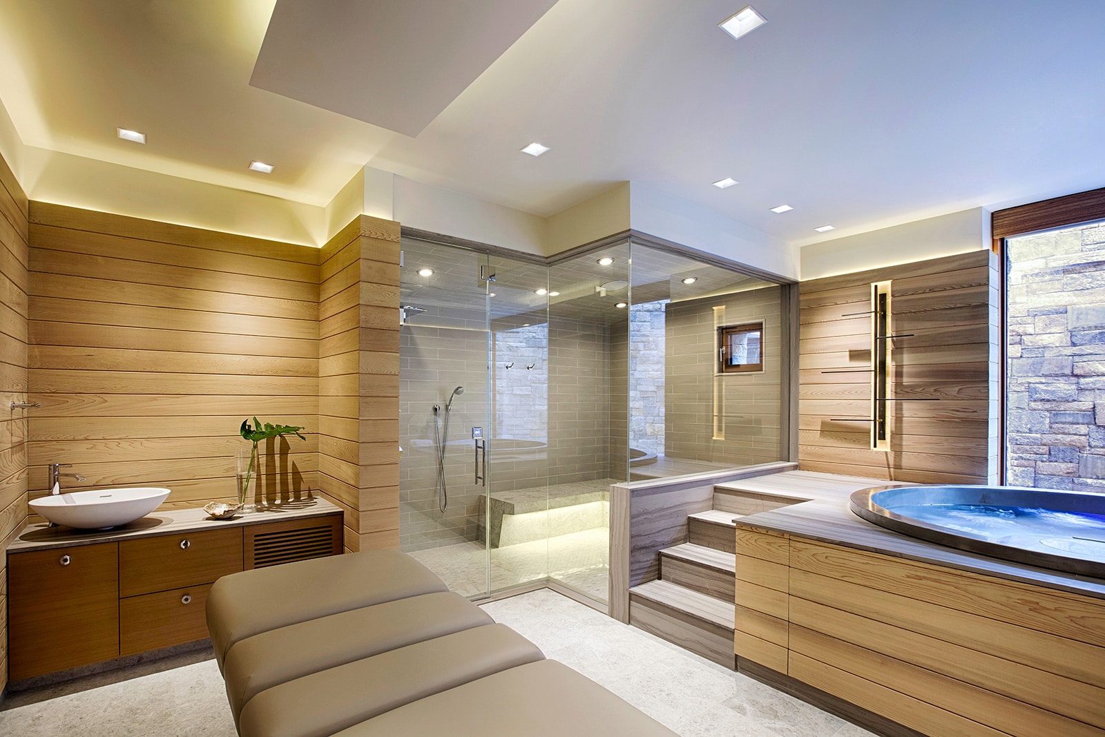 A complete gut renovation to create a luxurious spa with many components: steam room, sauna, Jacuzzi, massage area, changing room, bathroom, including custom millwork, custom tiles and sauna created on-scene.
