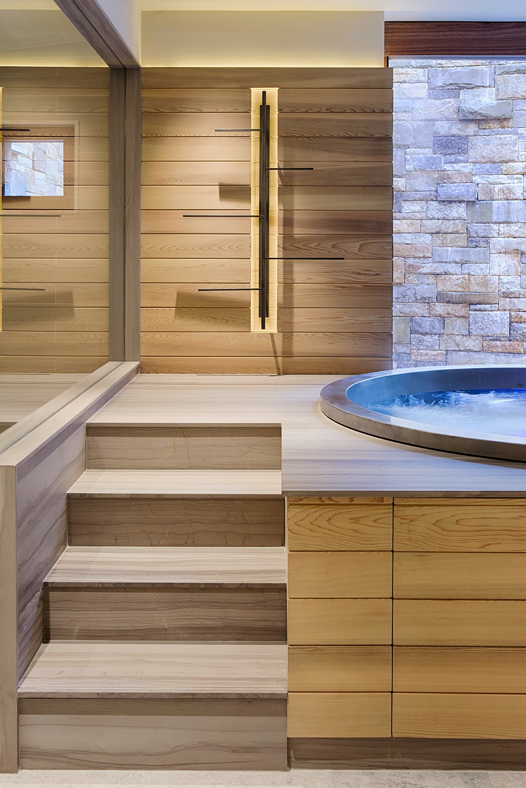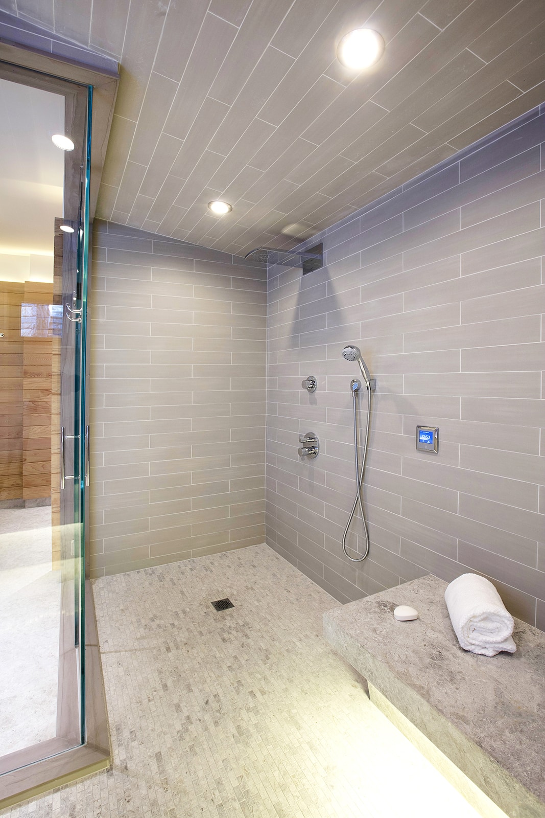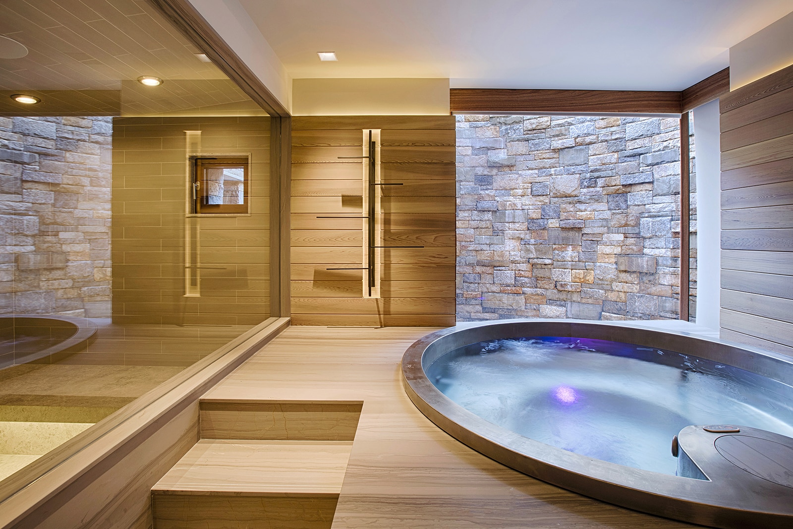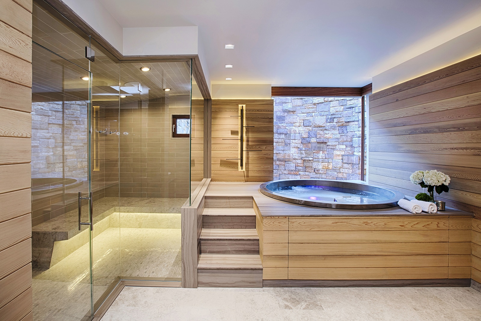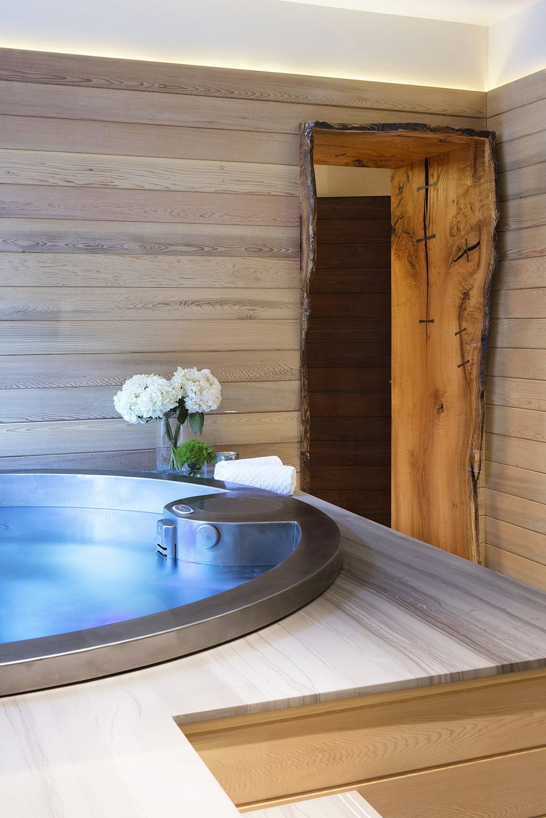 A complete gut renovation to create a luxurious spa with many components: steam room, sauna, Jacuzzi, massage area, changing room, bathroom, including custom millwork, custom tiles and sauna created on-scene.