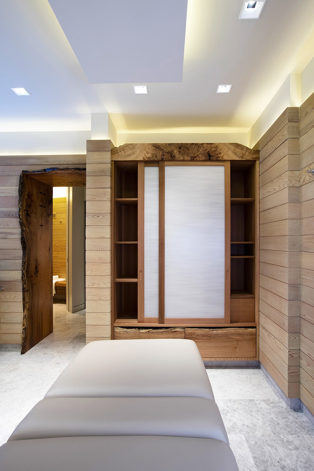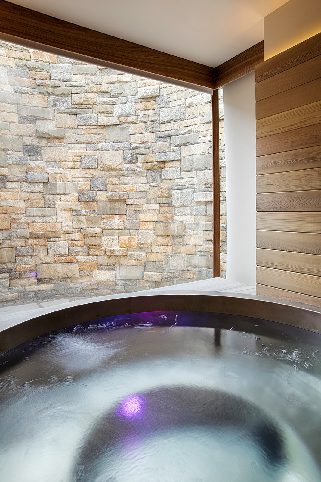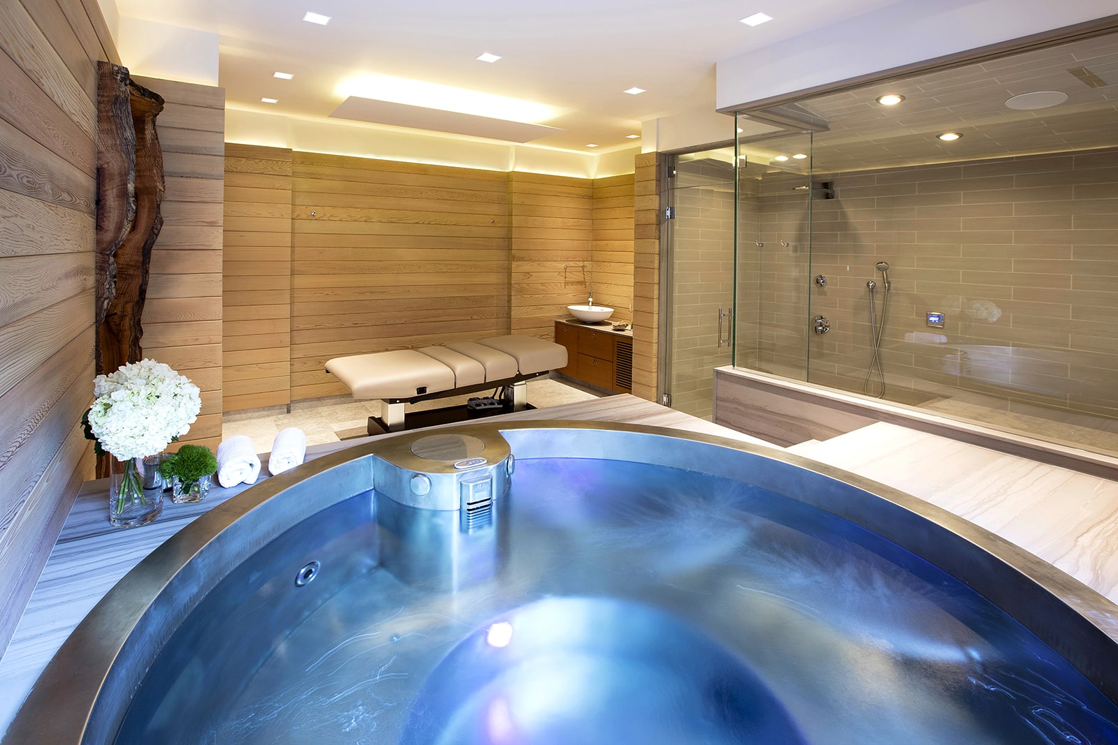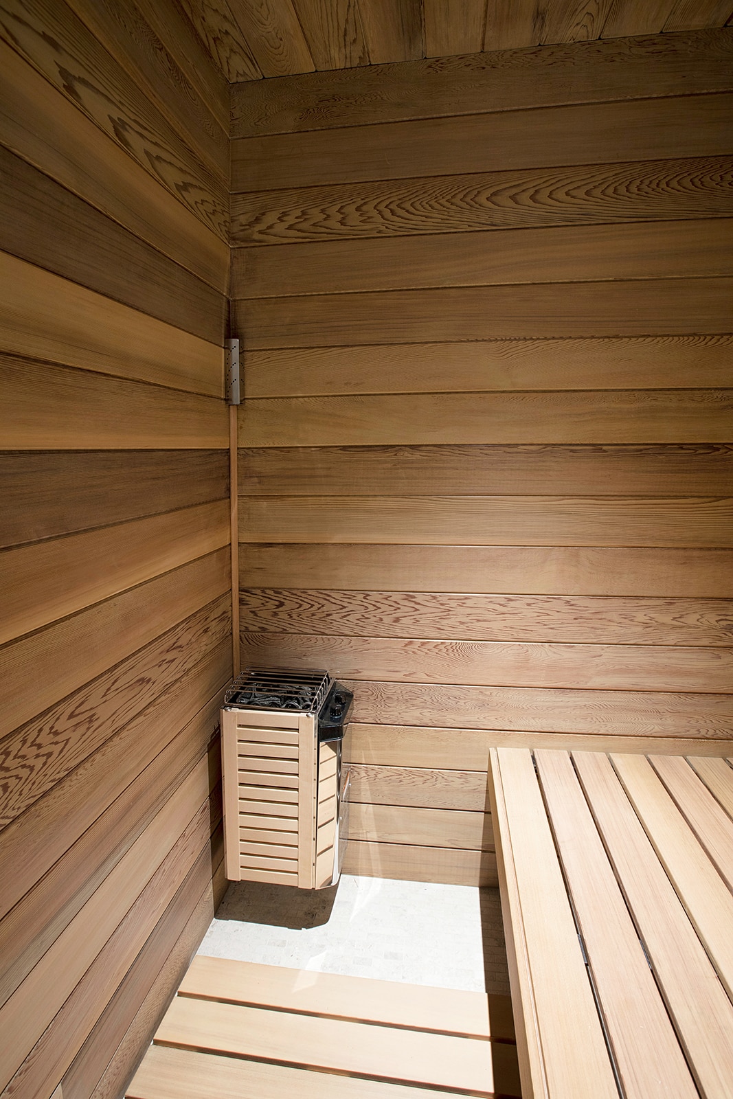 A complete gut renovation to create a luxurious spa with many components: steam room, sauna, Jacuzzi, massage area, changing room, bathroom, including custom millwork, custom tiles and sauna created on-scene.