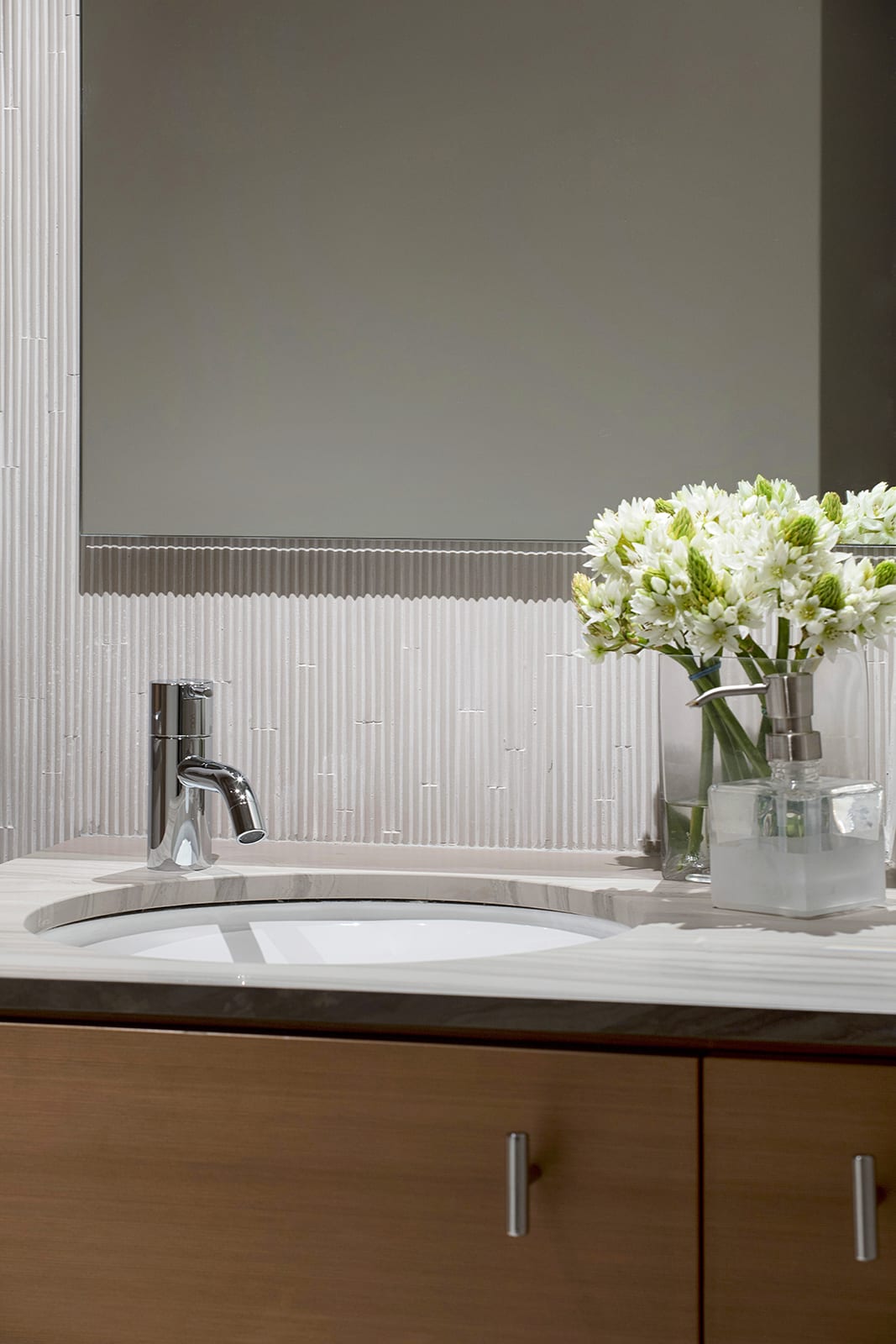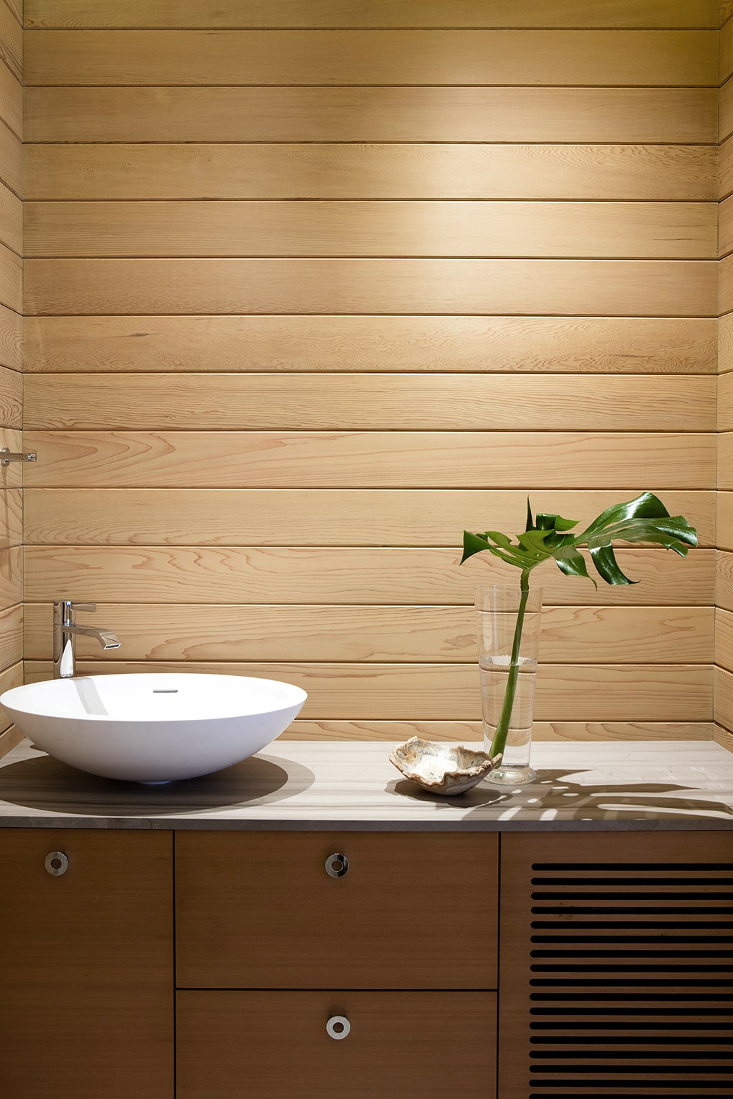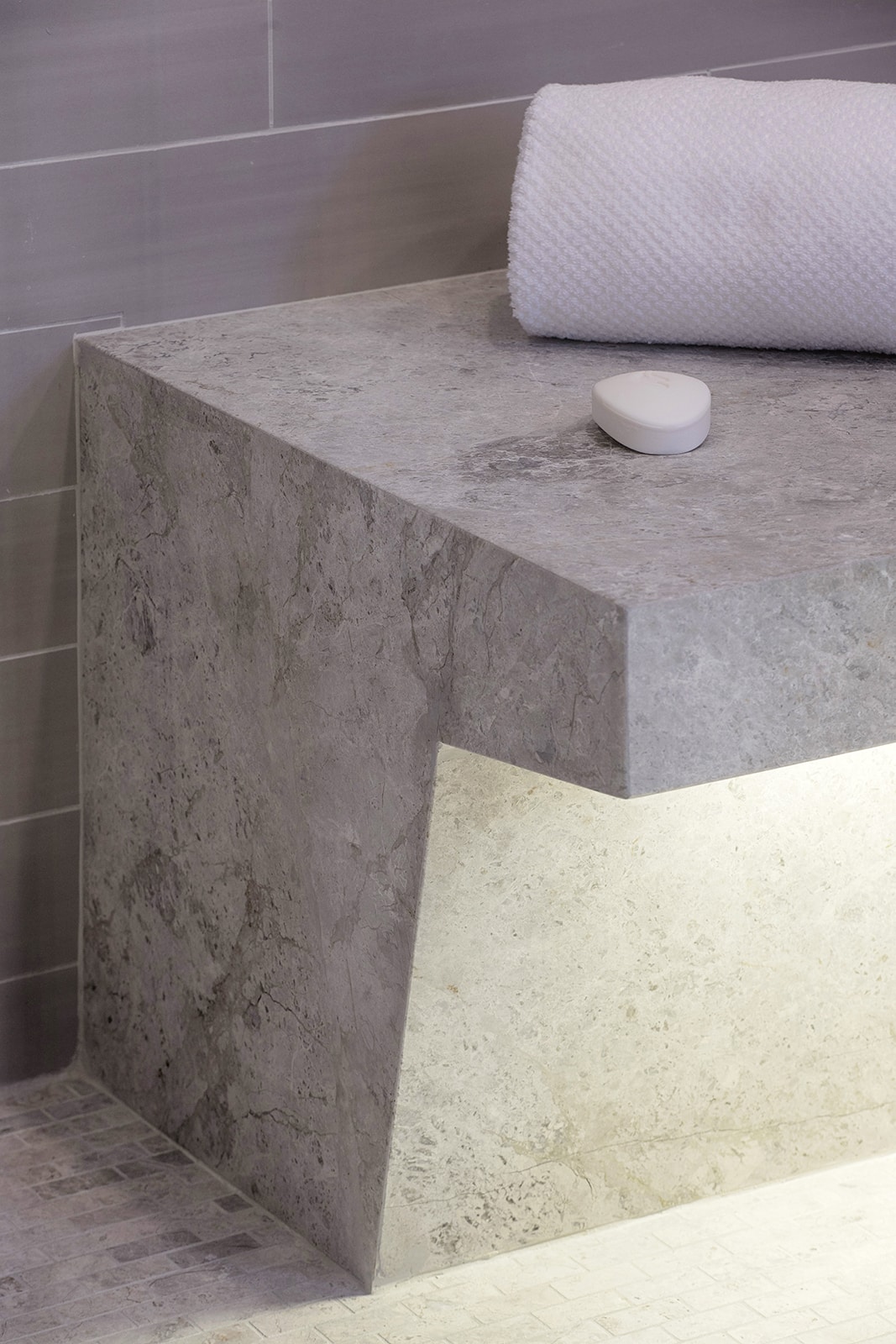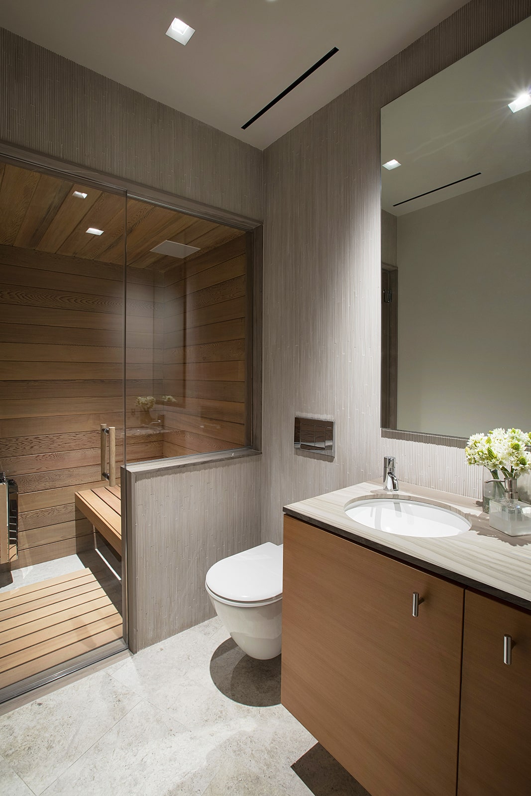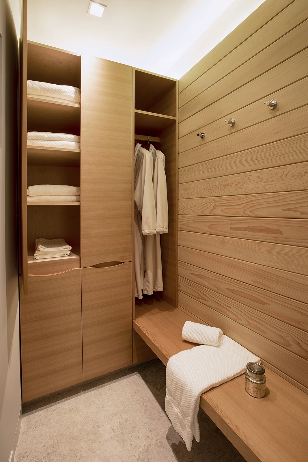 A complete gut renovation to create a luxurious spa with many components: steam room, sauna, Jacuzzi, massage area, changing room, bathroom, including custom millwork, custom tiles and sauna created on-scene.