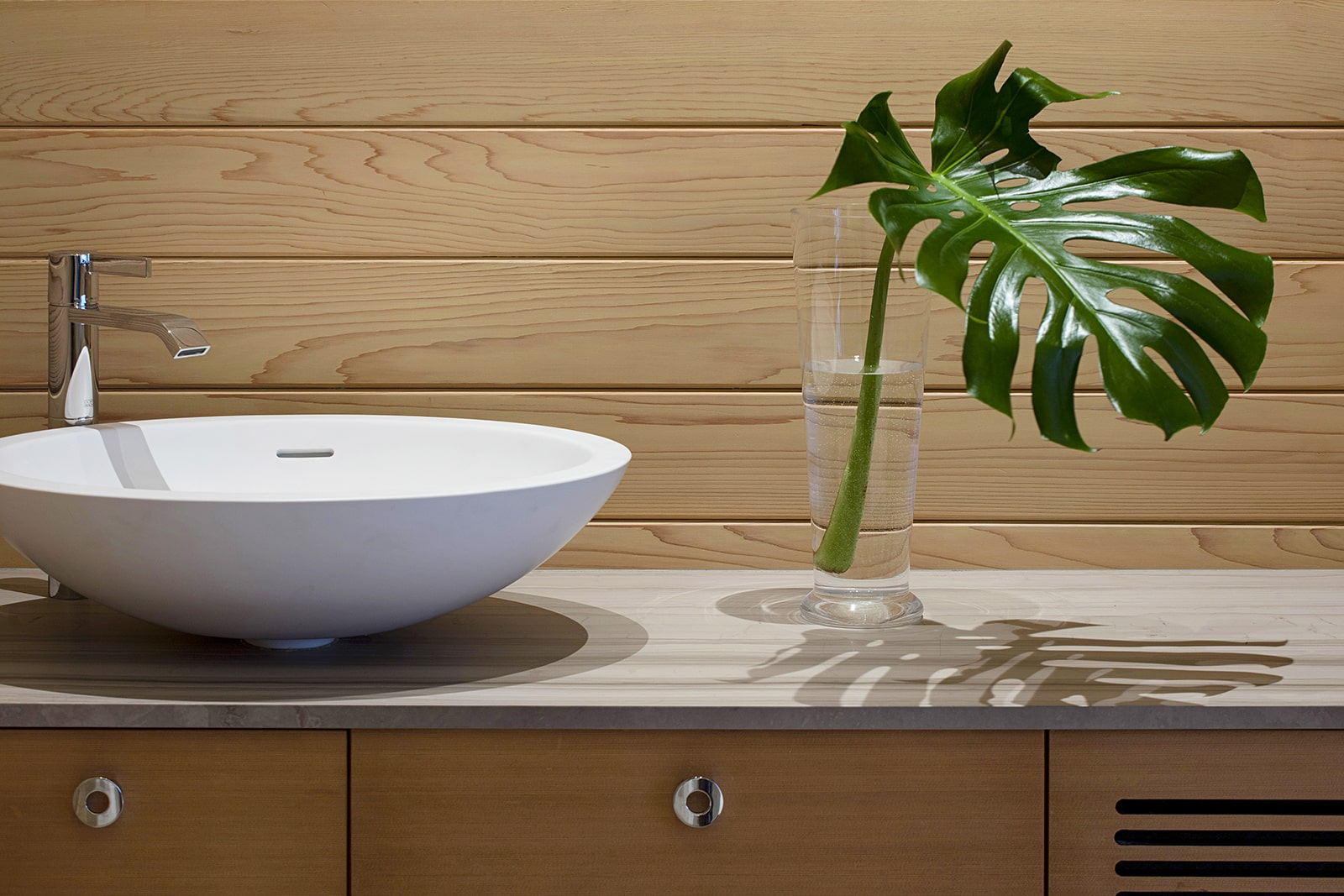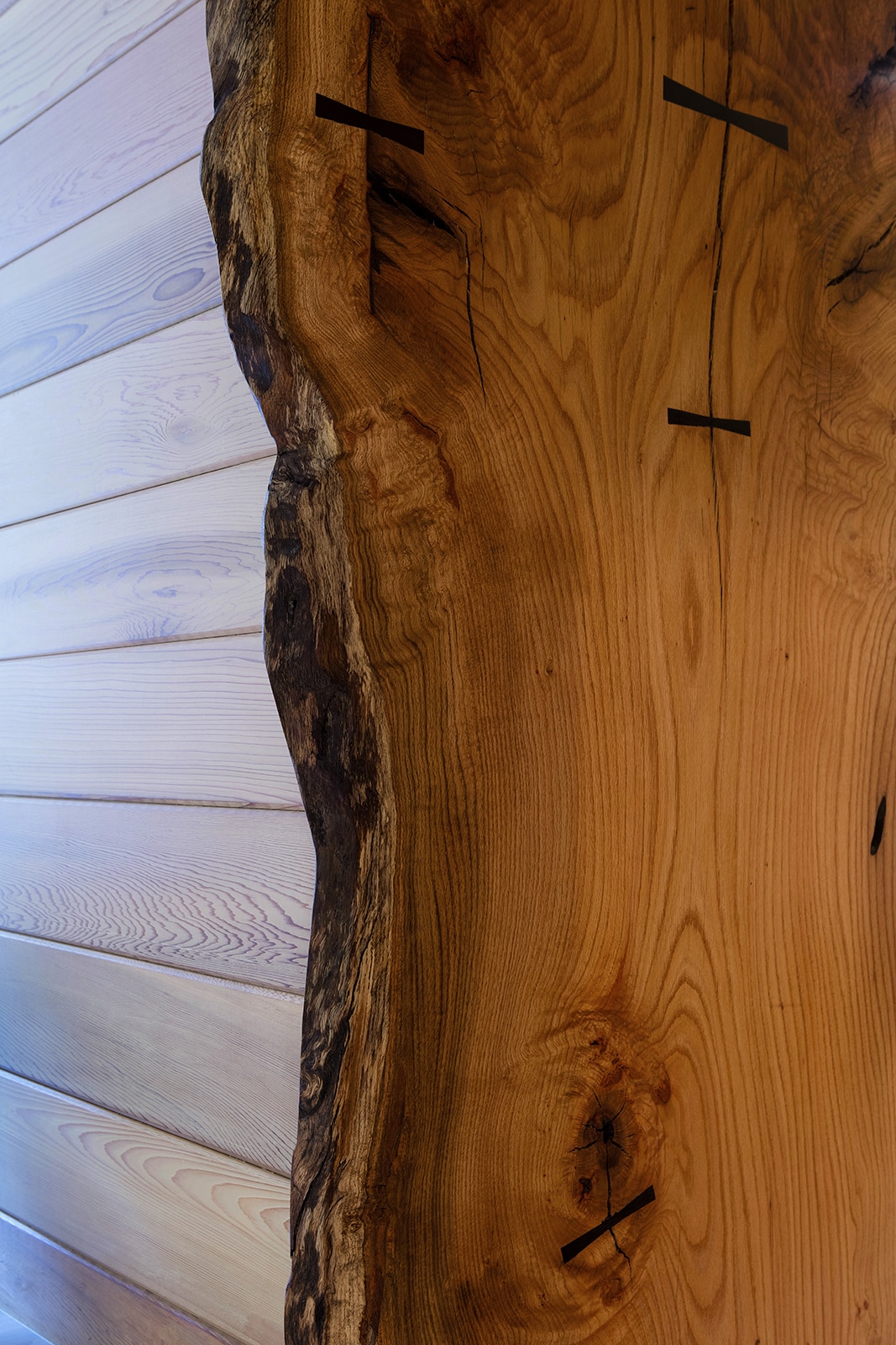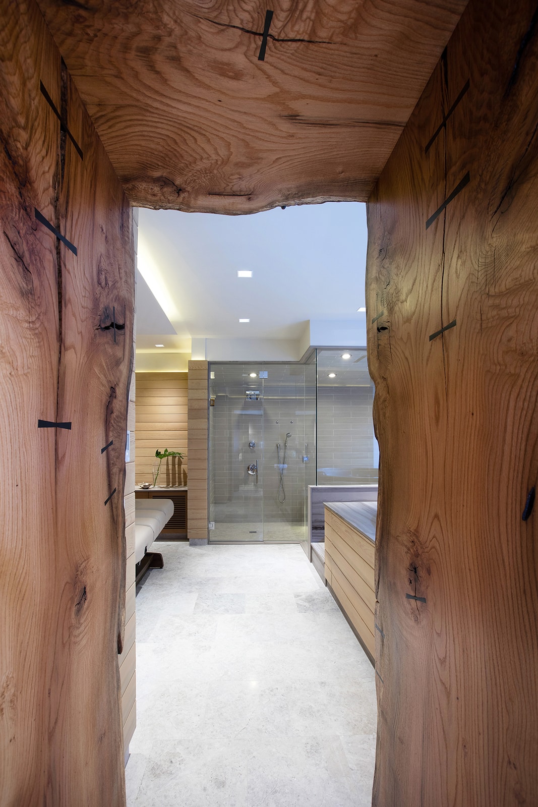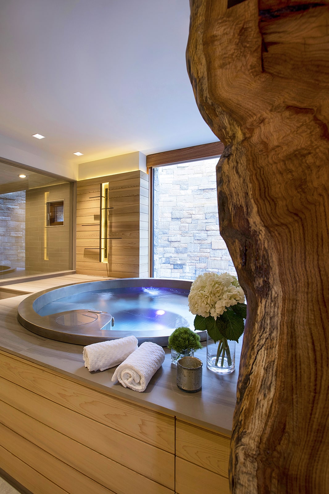 Unique woodworking including natural live-edge wood and cedar panels, exotic stone, glass panels and a stainless steel hot tub.